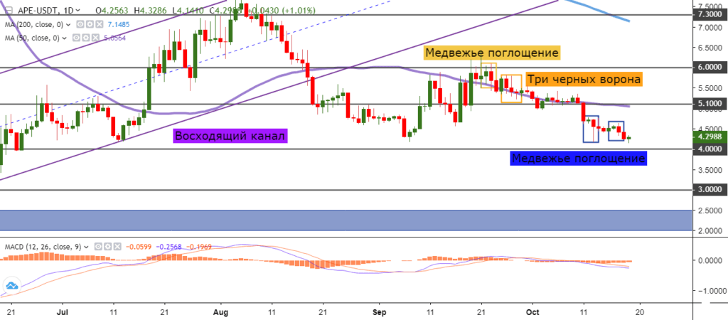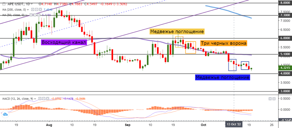В сегменте NFT одним из лидеров остается токен APE, стоимость которого консолидируется между поддержкой на уровне $4, а сопротивлением выступает уровень $5.1, где также проходит линия 50-дневной SMA.