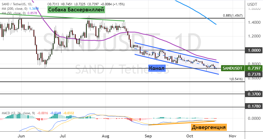 Сигналом о восстановлении бычьей динамики станет рост котировок SAND выше уровня $0.8. В таком случае быки будут готовы протестировать первые цели $1, $1.2 и $1.4, где также проходит линия 200-дневной SMA. В пользу реализации такого прогноза указывает бычья дивергенции между ценой на графике и осцилляторе MACD.