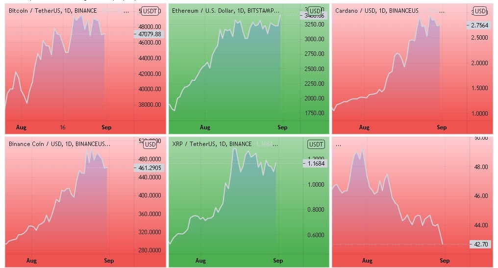 Динамика котировок BTC, ETH, ADA, BNB, XRP (дневной таймфрейм) и график доминации биткоина. Источник