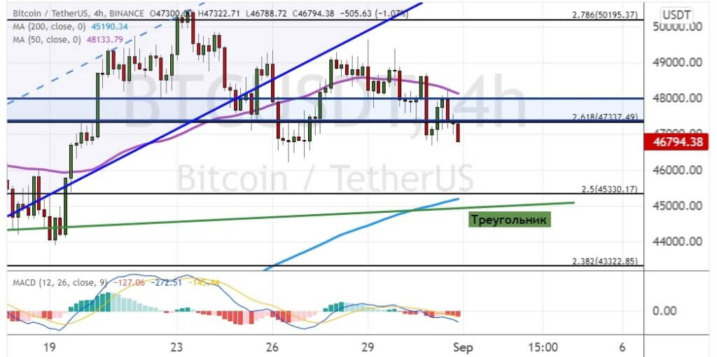 На графике ниже можно отметить, что котировки BTC двигаются в районе нижней границы консолидации уровней $47 500–$48 000, где также проходит линия 50-периодной простой скользящей средней (SMA).