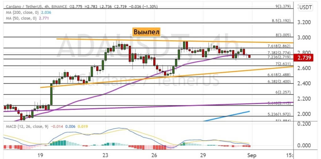 ADA продолжает консолидироваться между поддержкой $2.7 и сопротивлением $3. В то же время котировки альткоина продолжают движение внутри модели теханализа «Вымпел» (показана оранжевыми линиями на графике ниже) и вдоль линии 50-периодной SMA. Среднесрочными целями для роста ADA выступают уровни $3.2 и $3.4.