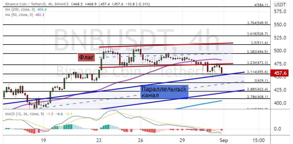 Но если BNB не сможет пробить уровень $500, то он вновь протестирует $475. А сохранение нисходящего импульса приведет к снижению до границ модели теханализа «Канал» (показан синими линиями на графике ниже) и уровней $440, $420 и $400, где расположилась 200-периодная SMA.
