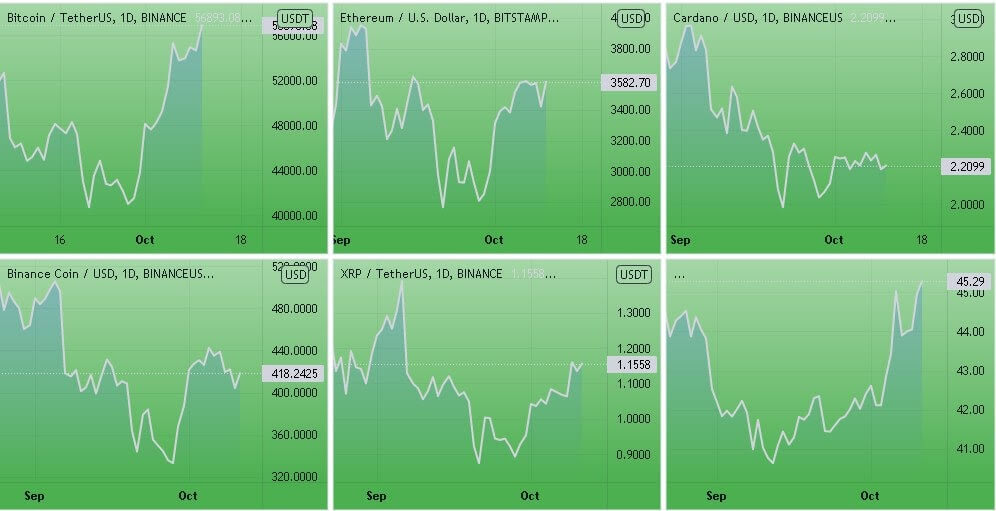 Динамика котировок BTC, ETH, ADA, BNB, XRP (дневной таймфрейм) и график доминации биткоина. Источник.