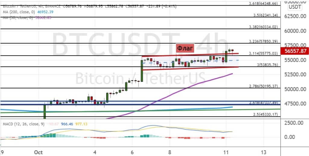 Котировки BTC вышли за рамки модели теханализа «Канал» (показана на графике ниже красным цветом) и поднялись выше границ консолидации $53 800–$55 800. В краткосрочной перспективе покупатели могут увидеть движение котировок в районы уровней $57 900 и $60 300. Сохранение восходящего импульса позволит биткоину устремиться к сопротивлениям $64 400 и $67 200.