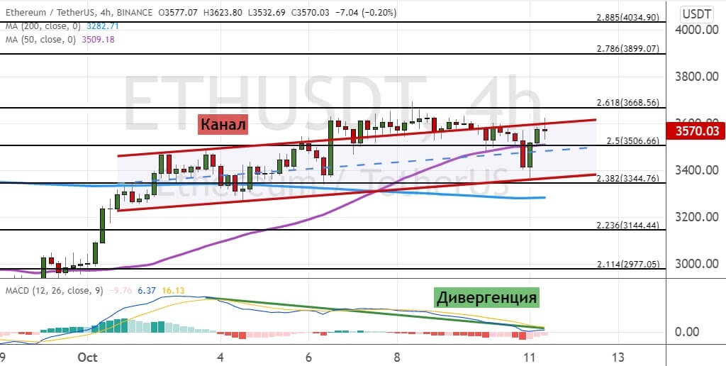 В рамках восходящего тренда эфир также сохраняет позитивную динамику, что привело к формированию графической модели «Канал» (показана на графике ниже бирюзовым цветом). Текущим сопротивлением выступает $3 670. Его преодоление приведет к росту котировок ETH выше уровня $3 800. В среднесрочной перспективе сохраняют актуальность цели $3 900 и $4 000.