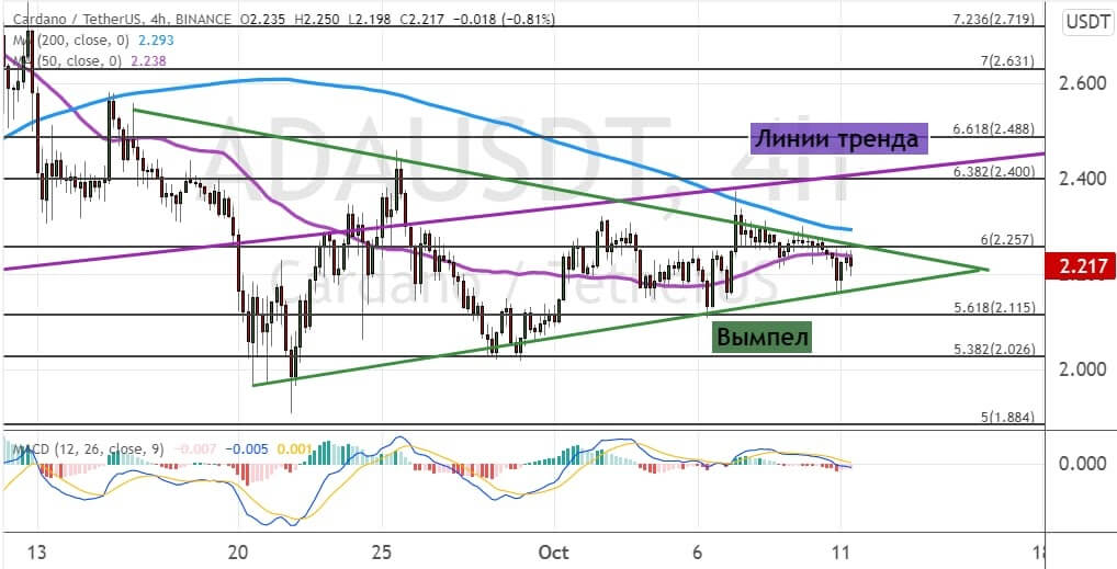 Котировки ADA развивают движение в рамках модели теханализа «Вымпел» (показана на графике ниже зеленым цветом), а также торгуются в районе уровня $2.25, где проходят линии 50-периодной и 200-периодной SMA. В случае роста выше $2.25 первыми целями для ADA выступят отметки $2.4 и $2.5. В районе последней также проходит линия тренда (показана фиолетовым цветом). В краткосрочной перспективе целями выступают $2.63 и $2.7.