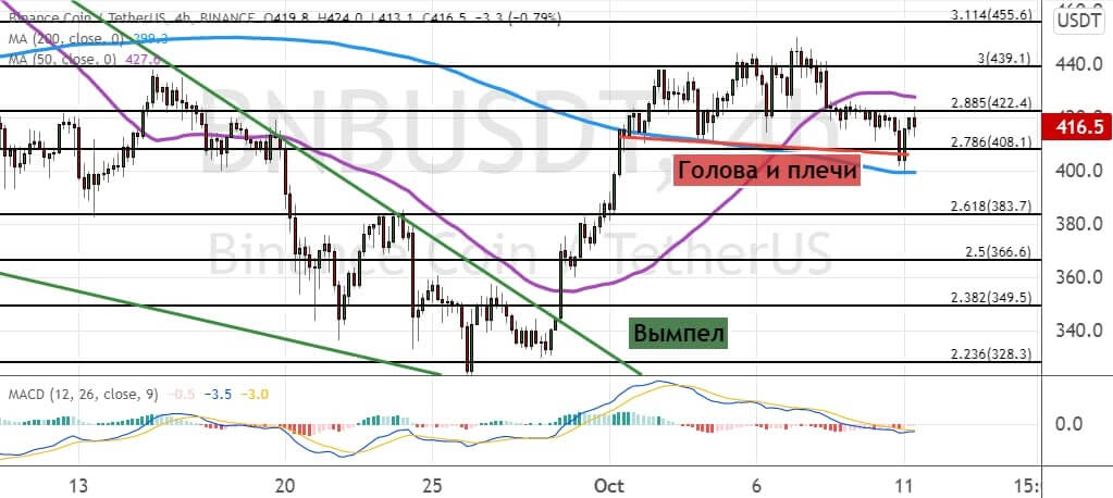 После выхода за рамки границ модели теханализа «Вымпел» (показана на графике ниже зеленым цветом) котировки BNB направились вверх. Сейчас альткоин торгуется между уровнями $408 и $422 и линиями 50-периодной и 200-периодной SMA. Также стоит отметить, что на графике BNB, возможно, формируется свечная комбинация «Голова и плечи» (показана на графике ниже бордовым цветом). Реализация данной фигуры направит котировки BNB к поддержкам $400 и $380.