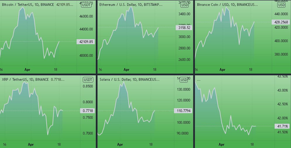 Динамика котировок BTC, ETH, BNB, SOL, XRP (дневной таймфрейм) и график доминации биткоина. Источник