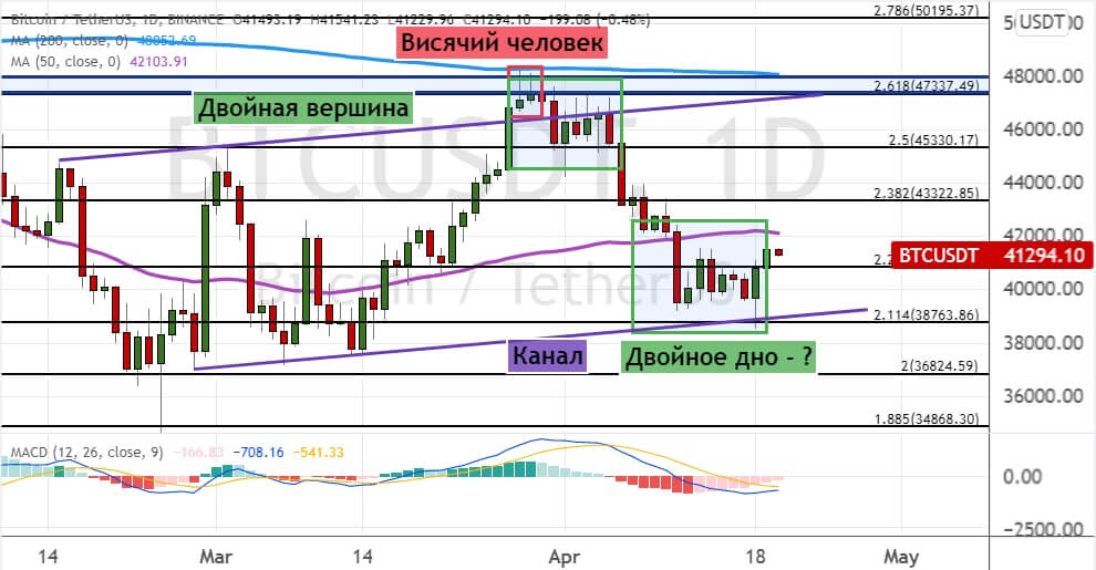 Однако на графике биткоина также есть сигналы, указывающие на возможное возобновление коррекционной динамики в виде модели теханализа «Двойная вершина» (обозначена на графике ниже линиями зеленого цвета), а также свечная комбинация «Висячий человек». Первыми целями для медведей выступают уровни $40 000 и $38 800. В районе последнего также проходит нижняя граница модели теханализа «Канал» (обозначена на графике ниже линиями фиолетового цвета). Сохранение медвежьей динамики направит котировки BTC в район поддержек $36 800 и $34 800.