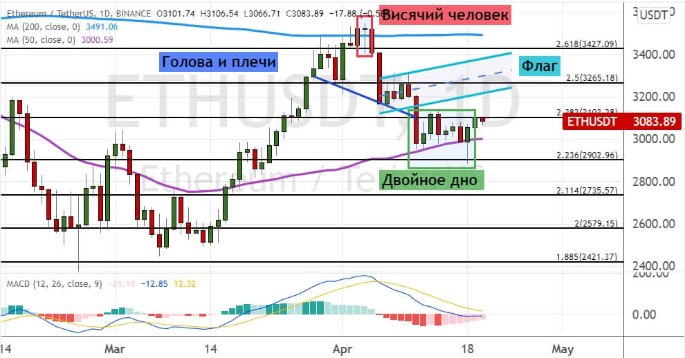 Однако вполне вероятно и возобновление медвежьей динамики. В пользу реализации этого прогноза указывают модели теханализа «Голова и плечи» (на графике ниже ее границы отмечены линиями синего цвета) и «Висячий человек». Если эфир опустится ниже $2 900, то следующими целями выступят уровни $2 800 и $2 730.
