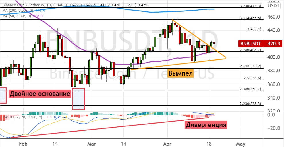 В рамках краткосрочного тренда BNB может направиться к первой цели $475, где проходит линия 200-дневной SMA. В пользу реализации этого прогноза указывают три сигнала: модель теханализа «Двойное дно» (обозначена на графике ниже красным цветом), прорыв границы модели «Вымпел» (обозначена на графике ниже оранжевым цветом) и дивергенция между ценой на графике и MACD.