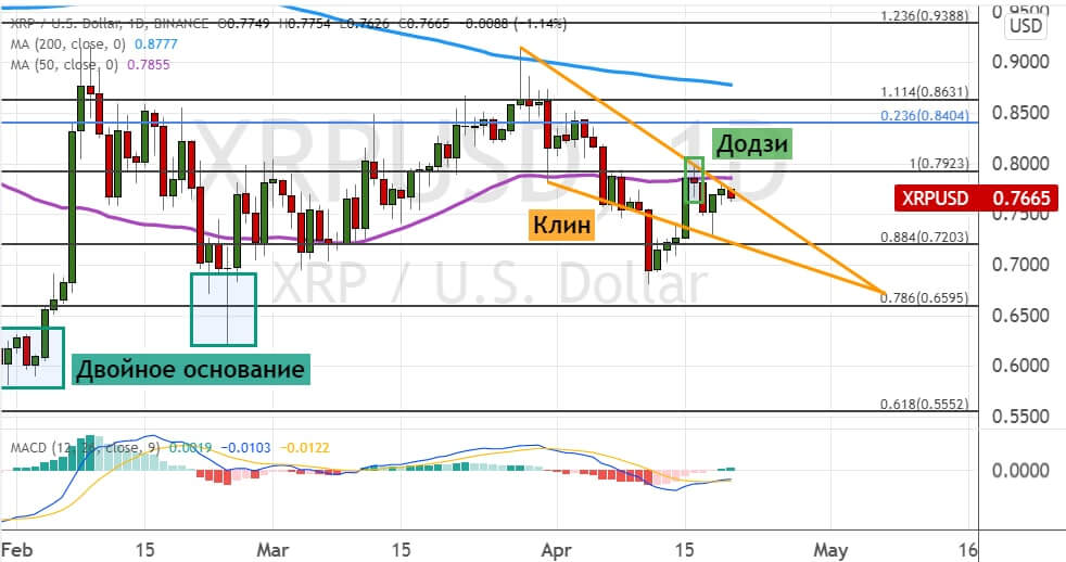 Котировки XRP развивают движение в границах модели теханализа «Клин» (на графике ниже обозначена оранжевым цветом). Текущие торги проходят чуть ниже уровня $0.8, где также проходит линия 50-дневной SMA. Поддержками для котировок XRP выступают уровни $0.75 и $0.72.
