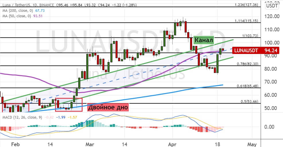 Сохранение восходящего импульса откроет путь для движения котировок LUNA к первой цели в виде границ консолидации $100–$104. Дальнейшее движение вверх приведет к росту до уровня $115. В пользу реализации этой идеи указывает модель теханализа «Двойное основание» (на графике ниже обозначена красным цветом).