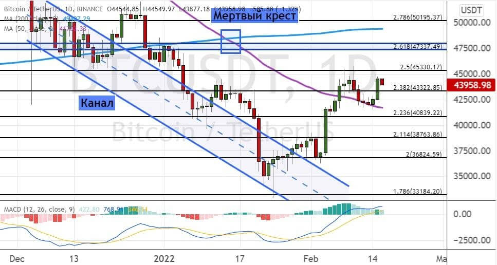 Однако не стоит забывать, что медведи могут вновь восстановить свои позиции. Сигналом об этом будет пробитие поддержки $43 300. В таком случае котировки BTC направятся вниз к уровню $42 000, где проходит линия 50-дневной SMA. Более глубокая коррекция приведет к снижению стоимости до уровней $38 700, $36 800, $35 000 и $33 200, где проходит верхняя граница модели теханализа «Нисходящий канал» (обозначена на графике ниже линиями синего цвета).