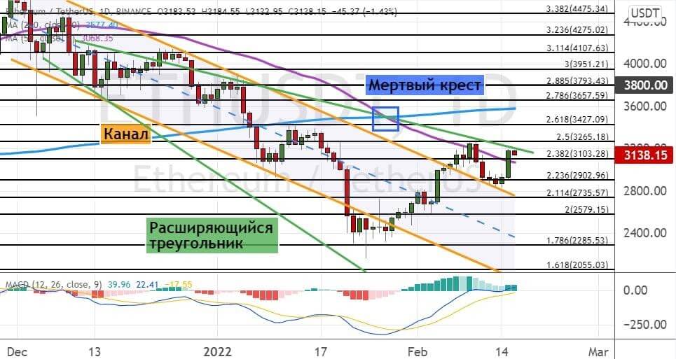 Котировки эфира торгуются в районе поддержки $3 100, где также расположены линия 50-дневной SMA и верхняя граница модели теханализа «Расширяющийся треугольник» (на графике ниже ее границы отмечены линиями зеленого цвета). При этом текущим сопротивлением выступает уровень $3 260.