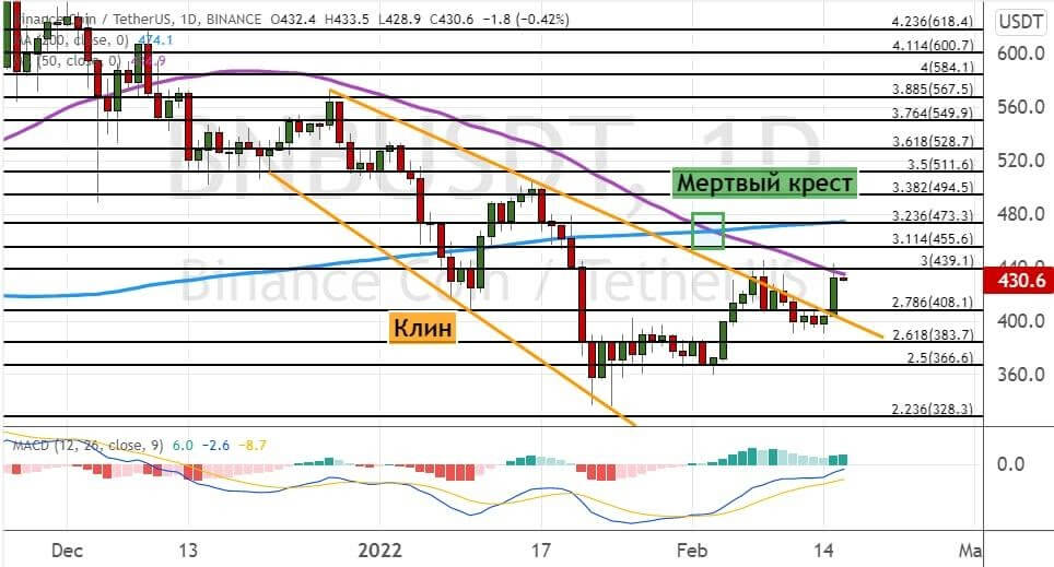 Котировки BNB развивают движение чуть ниже важных уровней сопротивления $430 и $440. В районе $440 проходит линия 50-дневной SMA. Поддержками для текущих котировок выступают $410 и психологически важный уровень $400, где расположилась верхняя граница модели теханализа «Клин» (на графике ниже обозначена линиями оранжевого цвета).