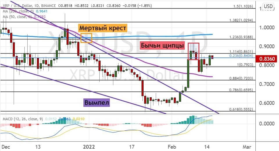 Если медведям удастся обвалить котировки ниже $0.8, то следующую поддержку XRP найдет на уровне $0.72. Закрытие дневных свеч ниже этого уровня приведет к восстановлению медвежьей динамики. В таком случае стоимость XRP направится к уровням $0.65 и $0.6, где проходит верхняя граница модели теханализа «Вымпел» (на графике ниже обозначена линиями фиолетового цвета).
