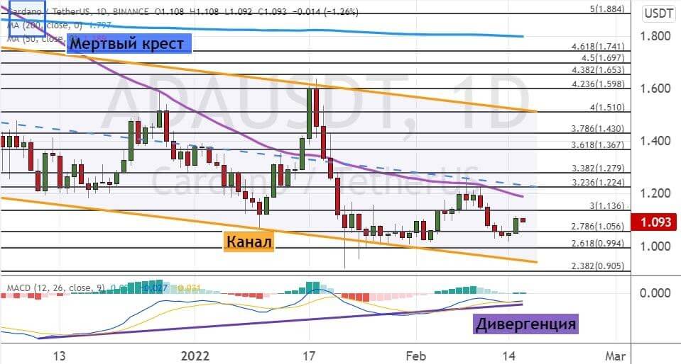 Сигнал в виде дивергенции между ценой на графике и осцилляторе MACD указывает на то, что котировки ADA могут вновь устремиться вверх и направиться к первой цели в виде границ кластера $1.22–$1.28, где расположены медиана модели теханализа «Нисходящий канал» (обозначена на графике ниже линиями оранжевого цвета) и линия 50-дневной SMA.