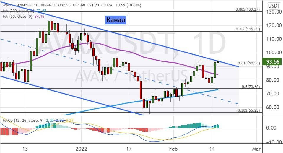 На первое место вернулась криптовалюта AVAX от проекта Avalanche, хотя капитализация LUNA от Terra незначительно отстает от лидера. Котировки AVAX вновь пытаются закрепиться выше уровня $91, где также проходит верхняя граница «Нисходящего канала» (модель обозначена на графике ниже линиями синего цвета).