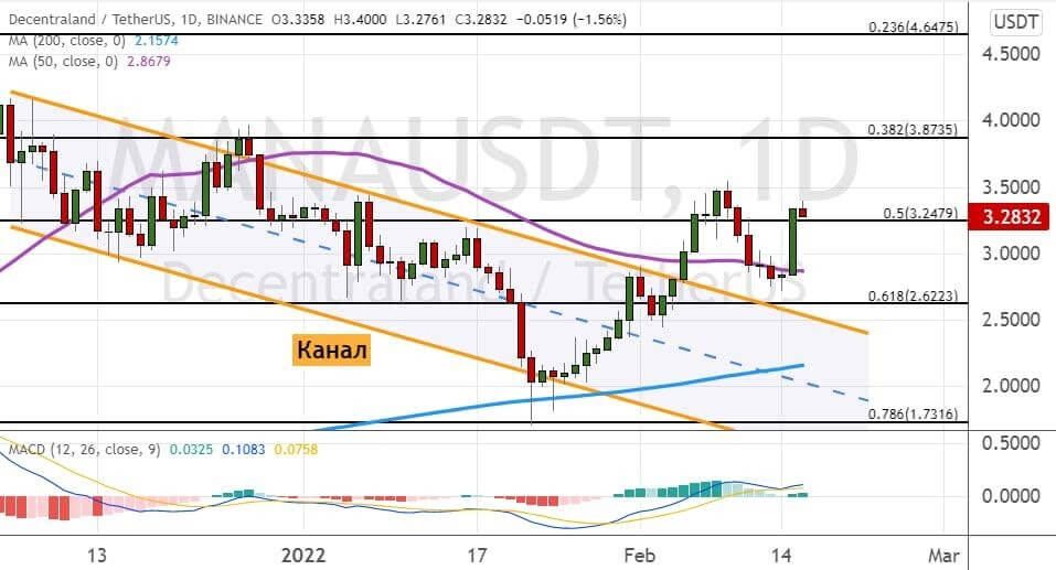 Но при условия падения ниже линии 50-дневной SMA и $2.65, где расположилась верхняя граница «Нисходящего канала» (модель обозначена на графике ниже линиями оранжевого цвета) медведи вновь возьмут контроль над торгами. В таком случае коррекция приведет к обвалу стоимости MANA до первой цели $2, где проходит линия 200-дневной SMA.