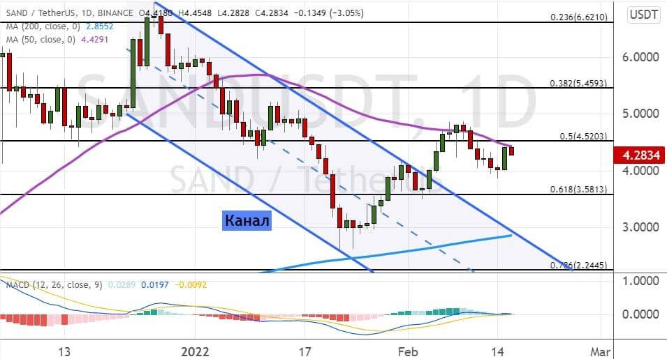 Если медведи смогут продавить уровень $3.6, то SAND направится к первой цели $3, где также расположилась линия 200-дневной SMA. Но более вероятно, что котировки SAND вновь направятся вверх и достигнут уровня $5.