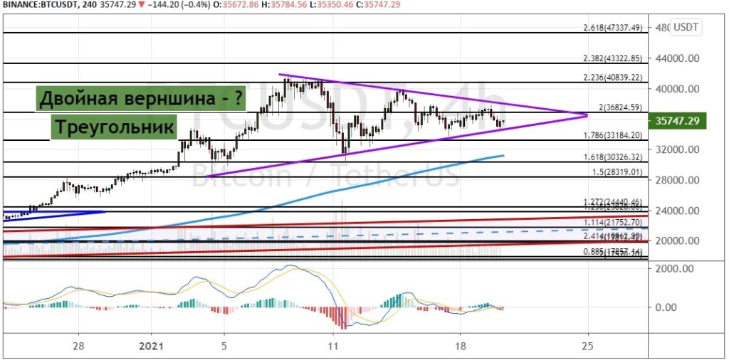 На возможное краткосрочное снижение котировок биткоина указывает формирующаяся модель теханализа «Двойная вершина». Если стоимость BTC опустится ниже важной линии поддержки на $33 180 (78.6% коррекция по уровням пропорции Фибоначчи), то этот сценарий подтвердится. В таком случае первой целью для медведей станет линия поддержки на отметке $30 326, где также проходит линия 200-дневной простой скользящей средней (SMA). Далее первая криптовалюта по капитализации устремится к цели $28 319 и кластеру $23 820 – $24 440.