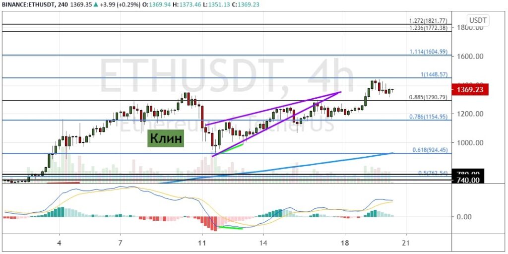 Эфир уверенно преодолел сопротивление на уровне $1 290 (88.5% коррекция по уровням пропорции Фибоначчи) и достиг первой цели в виде области $1 400 – $1 450. Сохранение восходящего импульса может отправить котировки далее вверх к среднесрочным целям в виде сопротивлений $1 600 и кластера $1 772 – $1 820.