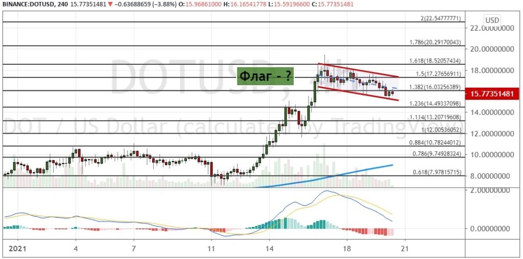 Котировки DOT показали коррекционную динамику, что привело к пробитию поддержки на уровне $17.30 (50% расширение по уровням Фибоначчи) и движению в районе текущей поддержки в виде области $16 – $16.50.