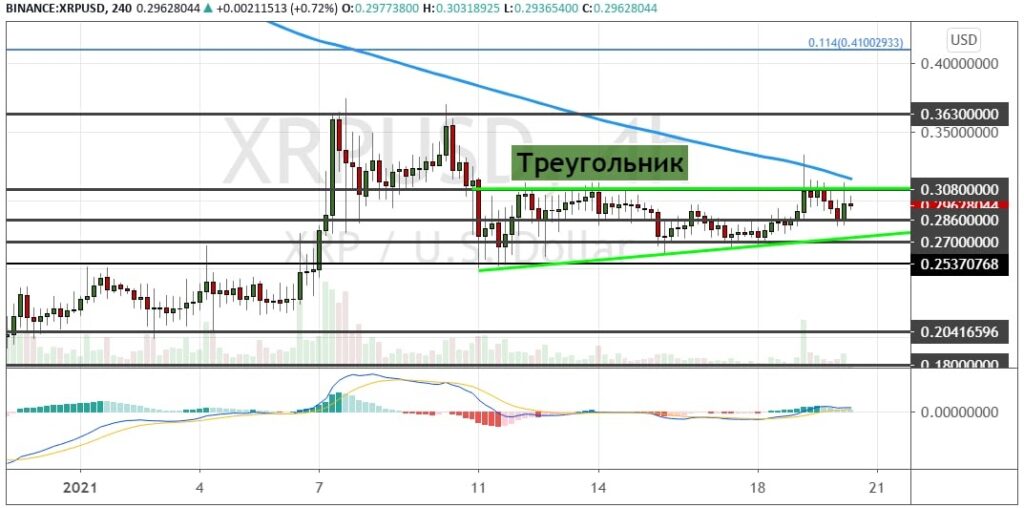 Рипл продолжает развивать консолидацию в рамках уровней поддержки $0.27 – $0.2860 и сопротивления $0.3080, где проходит 200-дневная SMA. Торги активом также идут внутри границ модели теханализа «Восходящий треугольник».