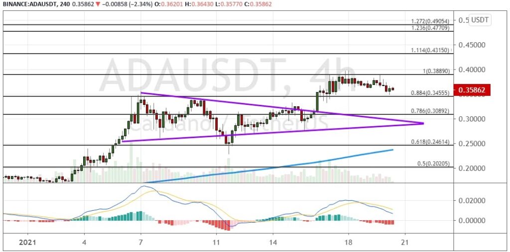 Котировки ADA развивают восходящую динамику, что привело к пробитию верхней границы модели теханализа «Треугольник», линии сопротивления на $0.3080 и движению к области $0.3940 – $0.40.
