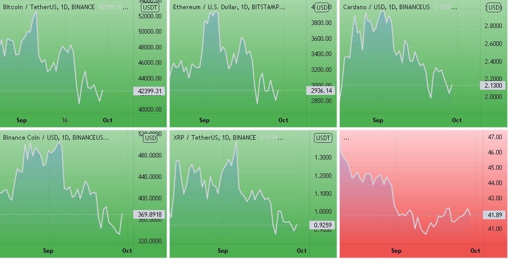 Динамика котировок BTC, ETH, ADA, BNB, XRP (дневной таймфрейм) и график доминации биткоина. Источник