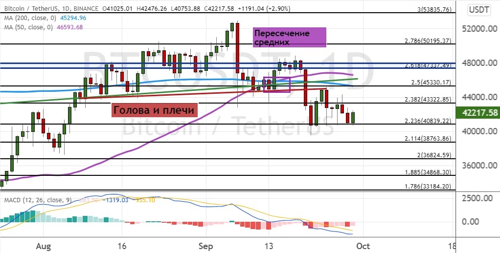 Сегодня биткоин вновь протестировал поддержку $40 800, после чего поднялся до уровня $42 000. Если котировки BTC опустятся ниже этого уровня, это откроет путь для снижения к первой цели $38 800. Данное движение будет происходить в рамках реализации модели теханализа «Голова и плечи» (на графике ниже линия шеи отмечена бордовым цветом). Дальнейшее снижение направит BTC к уровням $36 800, $34 900 и $33 200.