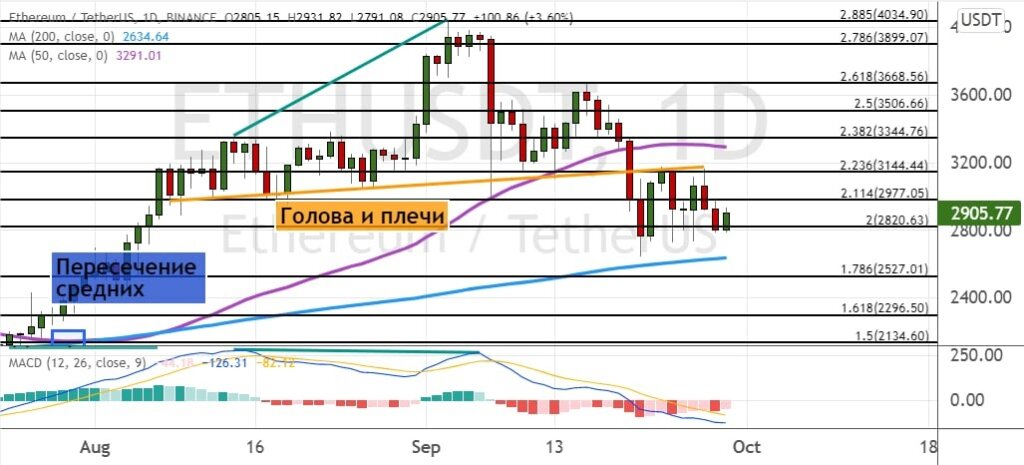 Эфир вновь протестировал поддержку $2 820, ниже которой проходит линия 200-периодной SMA. Уход ниже нее приведет к реализации модели теханализа «Голова и плечи» (показана на графике ниже оранжевым цветом), что позволит медведям продавить котировки ETH до уровней $2 650, $2 520 и $2 300.