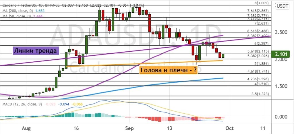Перелом тренда произойдет в случае роста стоимости ADA выше линии сопротивления $2.25 и кластера уровней $2.4–$2.5, где проходят линия тренда (на графике ниже отмечена фиолетовым цветом) и линия 50-дневной SMA. Первой целью для быков выступает уровень $2.63, а его преодоление откроет путь для роста к $2.72, $2.8 и $3.