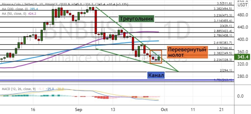 Однако формирования свечной комбинации в виде «Перевернутого молота» (на графике ниже обведена оранжевым цветом) и рост BNB выше $366 говорят о том, что быки имеют все шансы на победу. Первыми целями выступают уровни $380, где проходит линия 200-дневной SMA, а также $410 и $422, где расположена линия 50-дневной SMA.