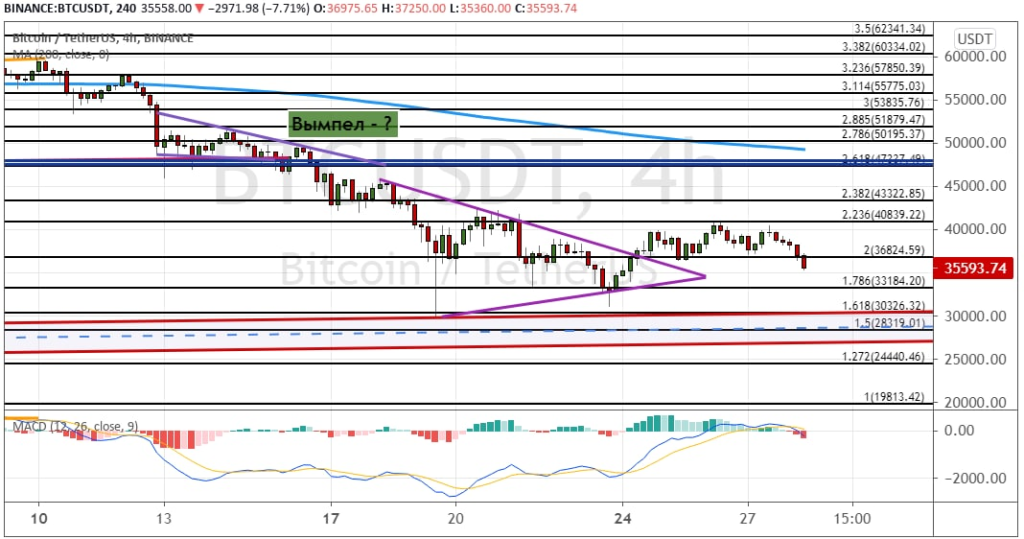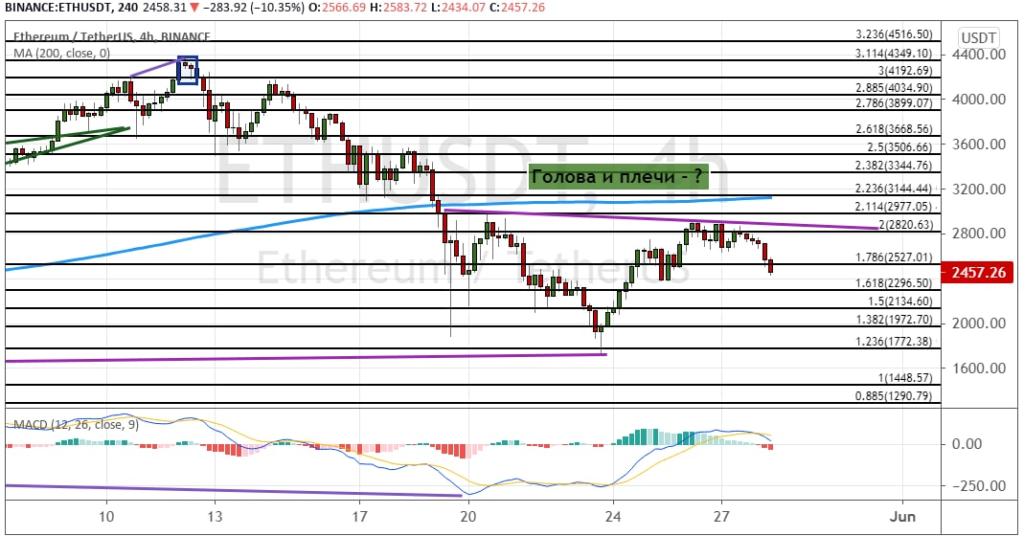 На графике биткоина сформировалась модель теханализа, похожая на фигуру «Голова и плечи», что привело к пробитию поддержки на уровне $36 800. Если нисходящая динамика сохранится, то котировки биткоина могут опуститься до уровня $33 200, а более глубокая коррекция направит BTC к $30 000 и $28 300. Этот сценарий развития торгов остается приоритетным. В случае реализации он может даже направить котировки BTC к поддержкам на уровнях $24 400 и $20 000, рассчитанным на основе пропорции Фибоначчи. В пользу этого указывает выход из зоны перепроданности на осцилляторе MACD.