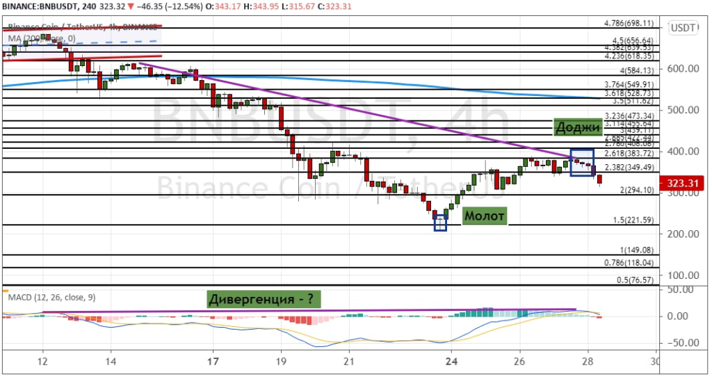 В последние дни BNB торговался между уровнями $350 и $380, но сегодня котировки альткоина начали опускаться. Если нисходящая динамика сохранится, то котировки BNB снизятся до первой цели на уровне $294. В пользу этого сценария развития торгов указывают свечные комбинации «Доджи» и дивергенция между ценой и MACD.