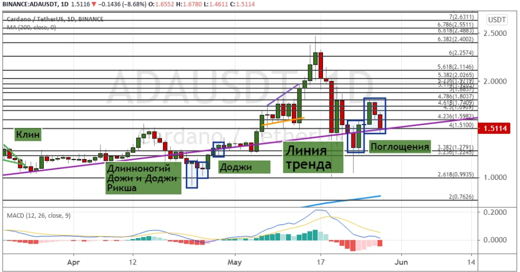 На графике ниже можно отметить, как котировки ADA достигли первой цели в районе уровня поддержки $1.5. Сохранение нисходящего импульса пока выглядит приоритетным сценарием развития торгов. Первыми целями выступают границы кластера $1.23 – $1.28 и уровень $1. Более глубокая коррекция приведет к $0.76, где проходит линия 200-дневной SMA.
