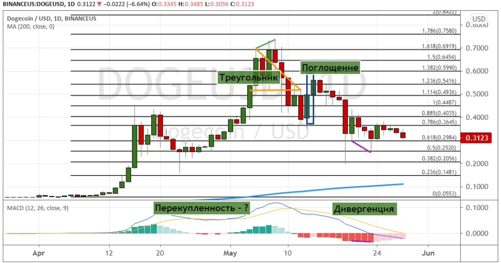 Однако восстановление восходящей динамики на всем крипторынке поможет поднять котировки DOGE выше текущих сопротивлений $0.3650 и $0.40. Первыми целями для роста выступают уровни $0.45, $0.50 и $0.54. Далее быки будут готовы к ретесту $0.60, $0.64, а в среднесрочной перспективе предстоящих месяцев и отметок—  $0.70, $0.76, $0.80 и $0.85.