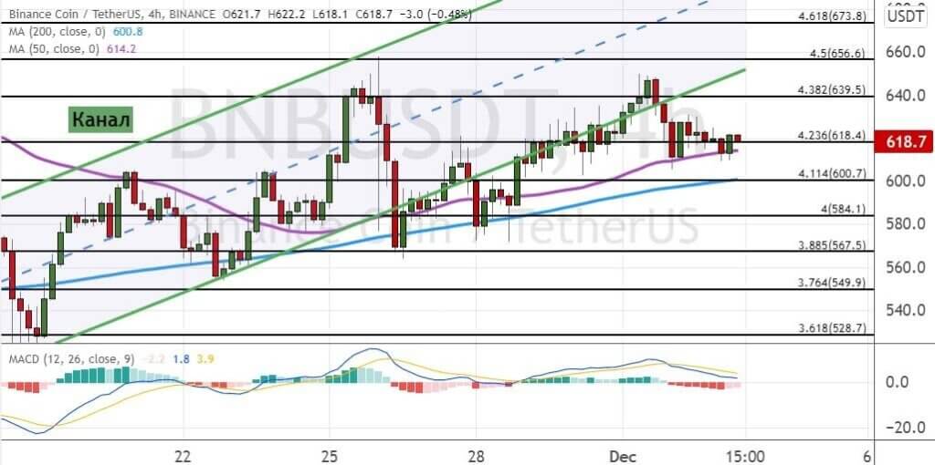 BNB опустился до поддержки на уровне $620, где также проходит линия 50-периодной SMA. Текущим сопротивлением выступает район $640.