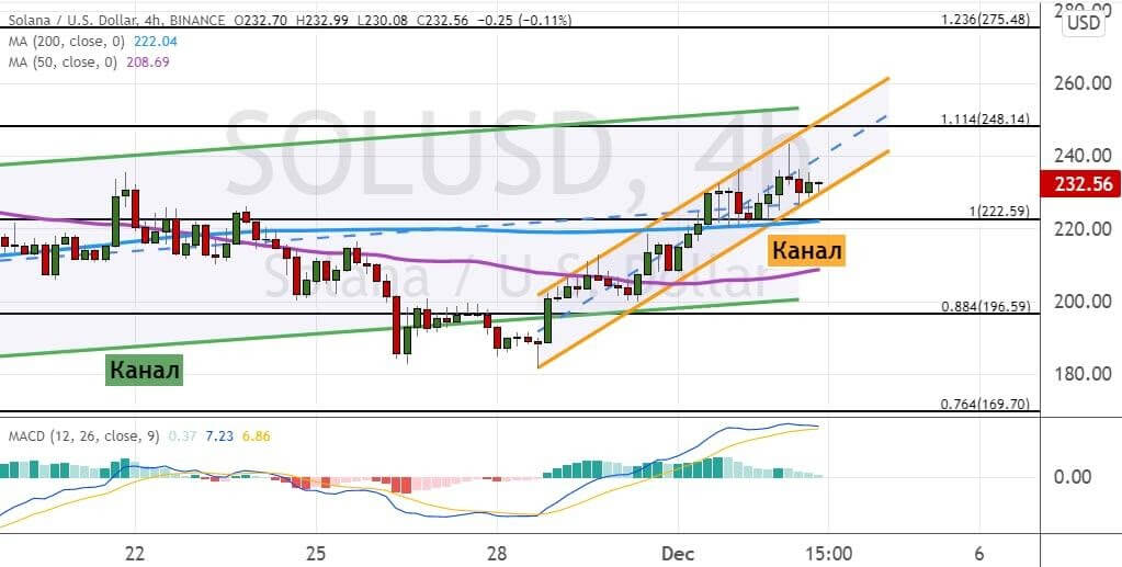 Котировки SOL двигаются в рамках модели теханализа «Восходящий канал» (обозначена на графике ниже оранжевым цветом) и выше текущей поддержки $223, где проходят линии 50-периодной и 200-периодной SMA.