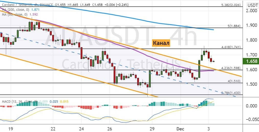 Котировки ADA поднялись выше уровня $1.6, где также проходит верхняя граница модели теханализа «Параллельный канал» (показана на графике ниже оранжевым цветом) устремились к первой цели $1.75.