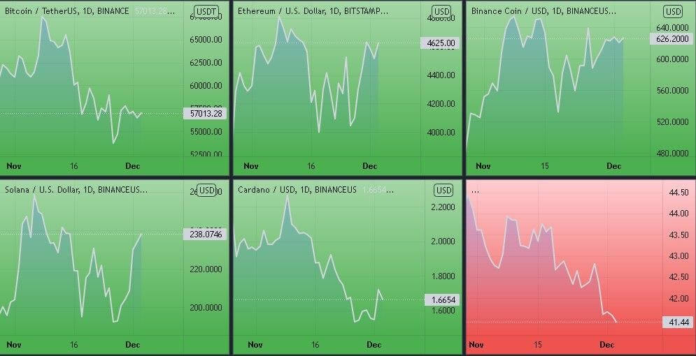 Динамика котировок BTC, ETH, ADA, BNB, XRP (дневной таймфрейм) и график доминации биткоина. Источник