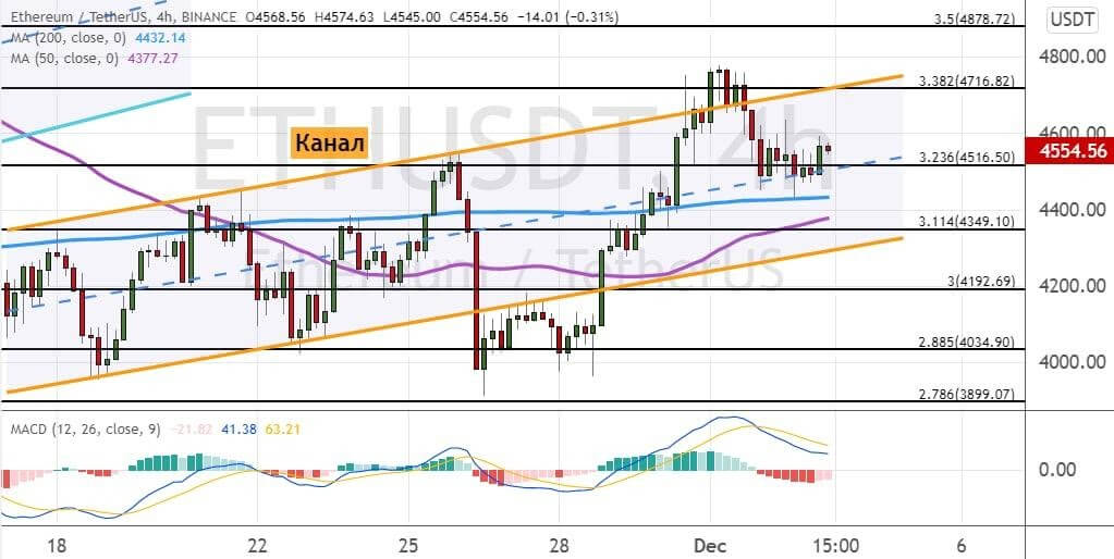 Эфир скорректировался до поддержки $4 520, ниже которой проходят линии 50-периодной и 200-периодной SMA. Текущее движение котировок ETH происходит внутри границ модели теханализа «Восходящий канал» (обозначена на графике ниже оранжевым цветом).