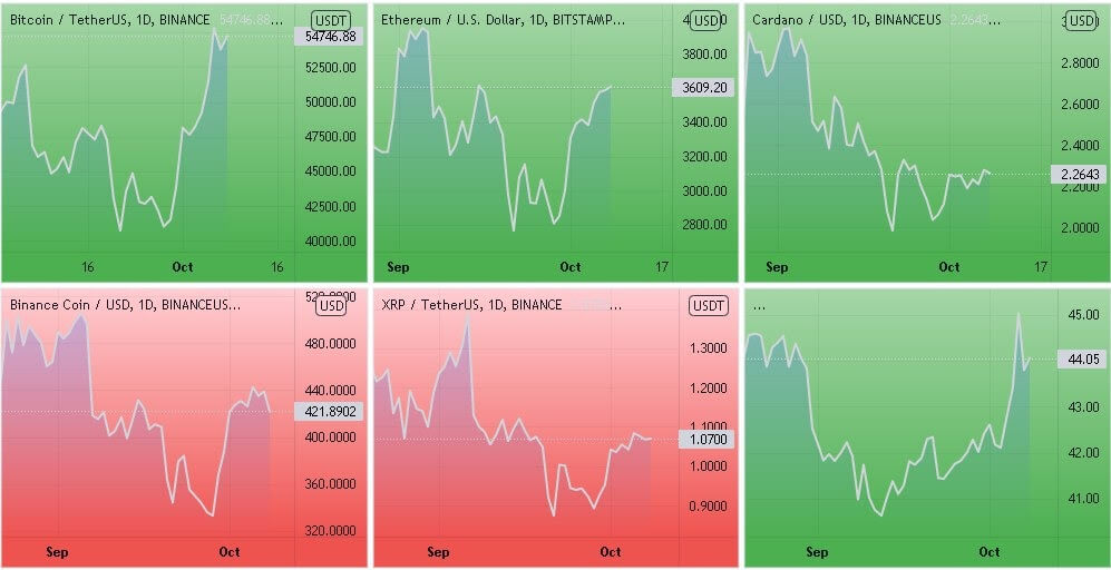 Динамика котировок BTC, ETH, ADA, BNB, XRP (дневной таймфрейм) и график доминации биткоина. Источник