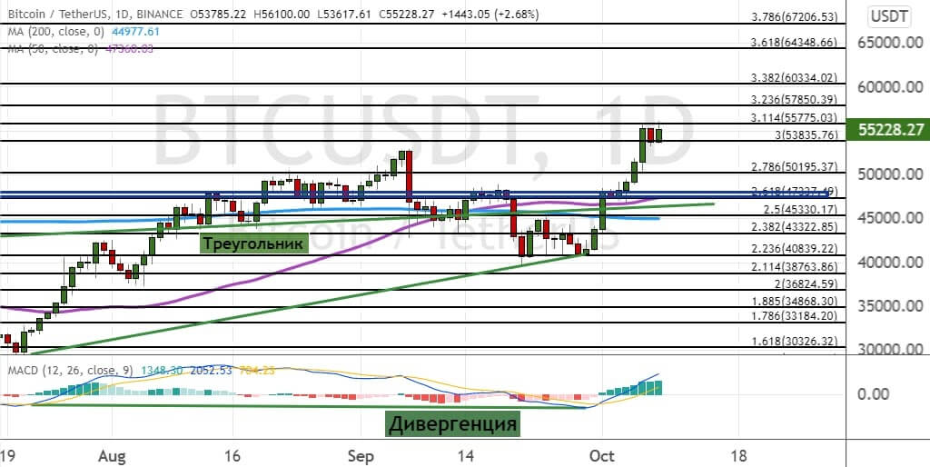 В краткосрочной перспективе быки будут готовы зафиксировать прибыль в районе $57 900 и $60 300. А в среднесрочной перспективе цена биткоина может обновить ценовые максимумы в районах $64 400 и $67 200. В пользу этого сценария развития торгов указывает бычья дивергенция между ценой на графике и осцилляторе MACD, что говорит о том, что котировки BTC готовы к мощному росту. Но для этого биткоину сначала надо закрепиться выше сопротивления $55 170.