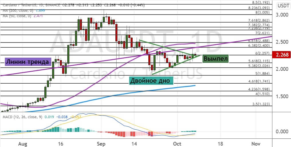 Котировки ADA продолжают движение в рамках модели теханализа «Вымпел» (показана на графике ниже зеленым цветом) и торгуются в районе $2.25 за монету. Если ADA удастся закрепиться выше этого уровня, это приведет к движению до $2.4 и $2.5, где проходят 50-дневная SMA и линия тренда (показана фиолетовым цветом). Следующей целью для быков выступает уровень $2.63. В пользу реализации этого сценария торгов также говорит модель теханализа «Двойное дно», которая сформировалась на графике ADA (показана бирюзовым цветом).
