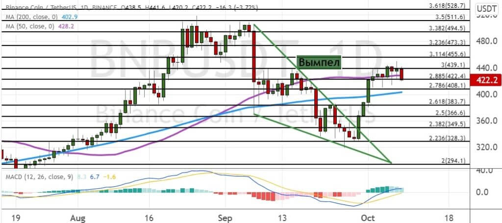 Котировки BNB вышли за рамки границ модели теханализа «Вымпел» (показана на графике ниже зеленым цветом), что привело к тестированию целей $440 и $455. Закрытие дневных свечей выше $455 позволит быкам поднять стоимость BNB до целей $470, $500 и максимума сентября $511. При этом в случае падения актива ниже уровней $422 и $408, где проходит линия 50-дневной и 200-дневной SMA, его стоимость может обвалиться и  до поддержек $400 и $380.