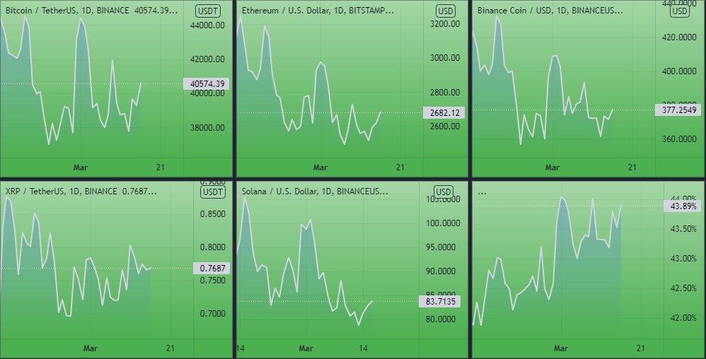 Динамика котировок BTC, ETH, ADA, BNB, XRP (дневной таймфрейм) и график доминации биткоина. Источник