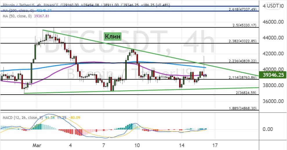 Однако если биткоину удастся закрепиться выше сопротивления $40 800, где проходит верхняя граница «Клина», то далее котировки будут готовы устремиться к целям $42 200 и $43 300.